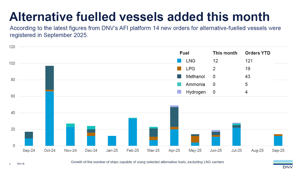 Selon DNV, 12 des 14 commandes de navires à carburants alternatifs en septembre 2025 concernaient des unités fonctionnant au GNL.