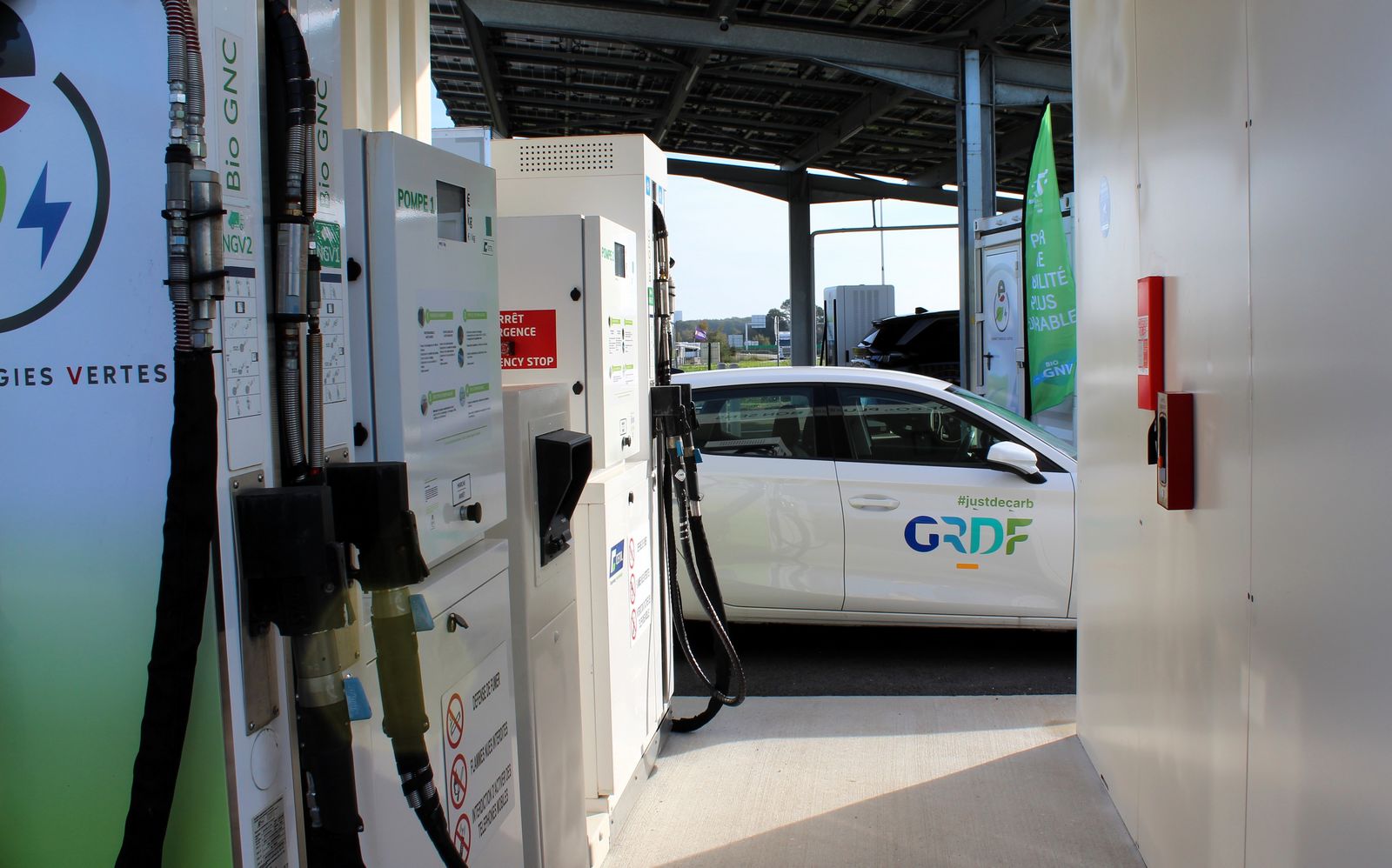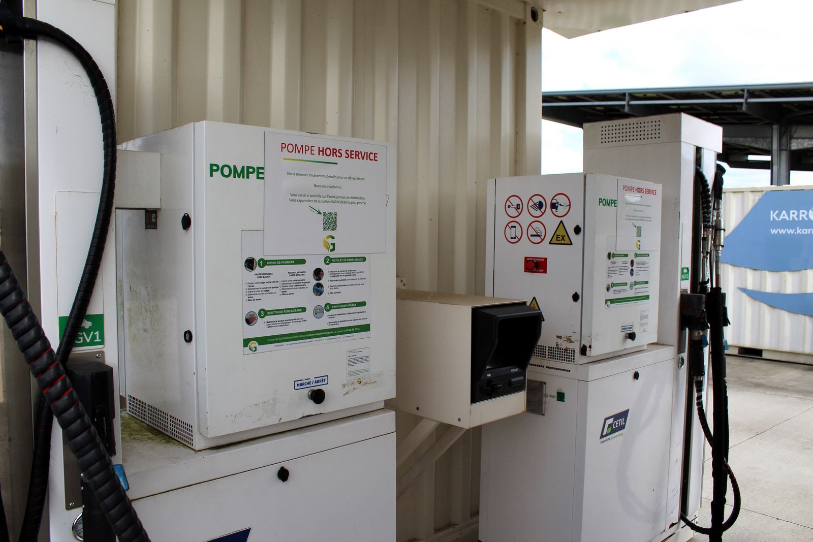 Ces indications sont reproduites au niveau des distributeurs où des araignées se moquant du panneau « pompe hors service » ont déjà élu domicile. Là nous reviennent en mémoire les moments passés avec Théophine Mini en octobre 2021 pour la présentation de sa Renault 4 fourgonnette convertie au GNV/bioGNV. La station n’était alors ouverte que depuis un peu plus de trois mois.