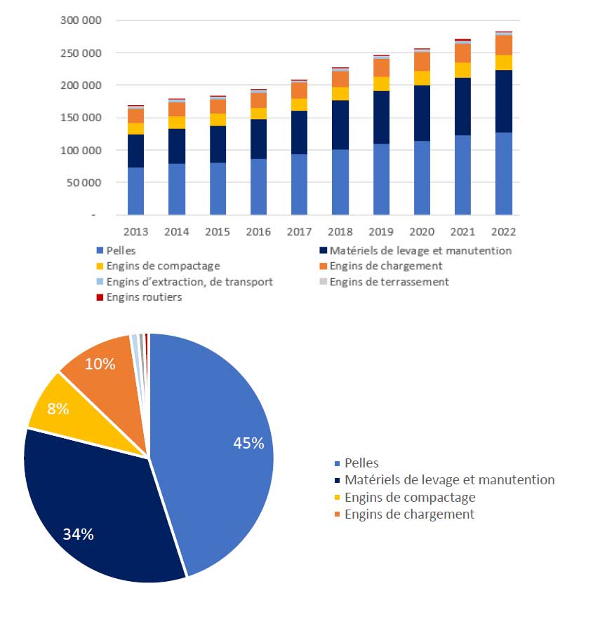 A elles seules, les pelles sur chenilles ou pneus ont représenté 45 % des EMNR de construction en 2022, soit 127 633 unités sur un total de 283 443 engins. Signe d’un véritable dynamisme du secteur, elles n’étaient que 73 611 en 2013 sur un parc total de 168 714 véhicules. Sur la même période, les nacelles élévatrices ont plus que doublé en passant de 26 832 unités à 59 426. Suivent les chariots télescopiques (de 21 349 à 34 925 exemplaires), les chargeurs sur pneus (de 21 367 à 29 620), et les rouleaux compresseurs (de 18 104 à 23 411).