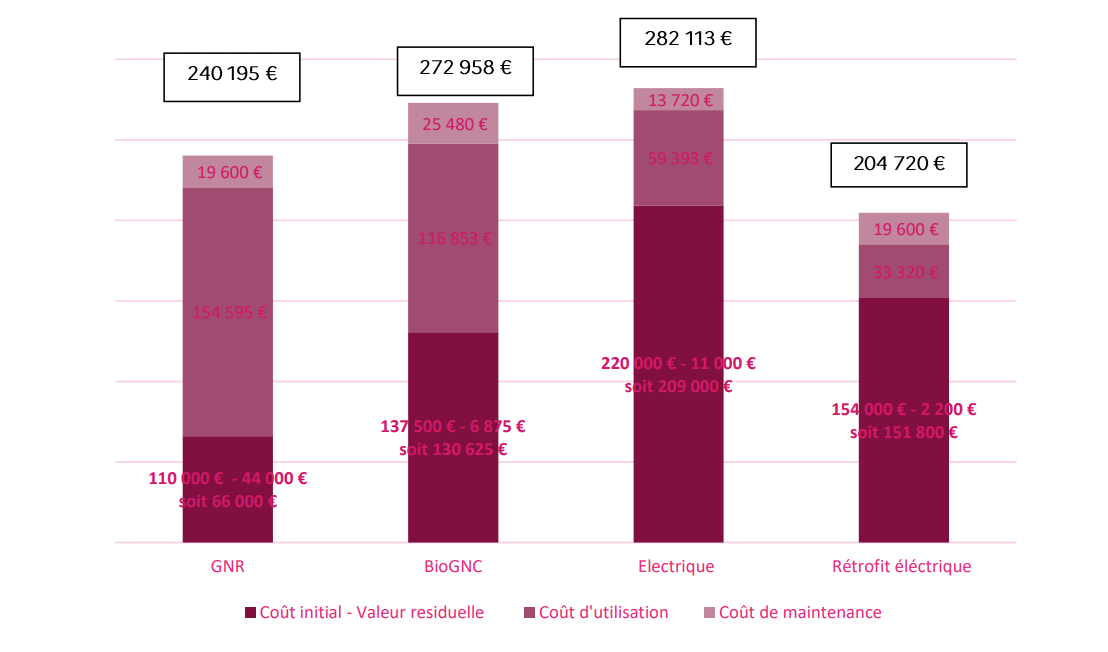 Seul le rétrofit électrique fait mieux avec 204 720 euros, contre 282 113 pour un neuf à batterie. Le bioGNC s’inscrit entre les deux avec une valeur pas forcément très séduisante : 272 958 euros.
