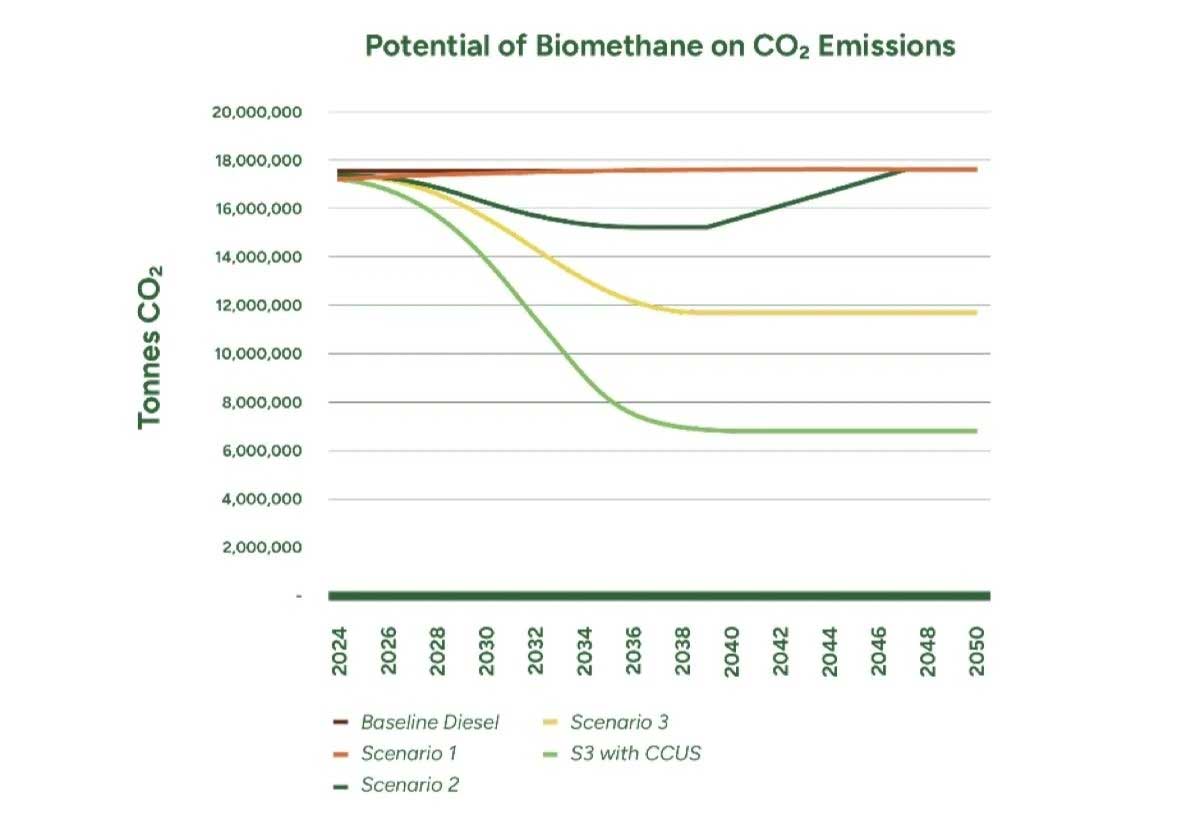 Le potentiel britannique est estimé à 120 TWh d’ici 2050, soit suffisamment pour alimenter la totalité du parc de poids-lourds si nécessaire. Selon les projections, le biométhane pourrait permettre jusqu’à 112 millions de tonnes de CO2 évitées d’ici 2040, voire 206 millions en combinant production et capture carbone.