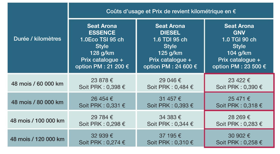 Sous l’effet de différentes mesures gouvernementales prises en faveur de la mobilité à énergie alternative, la principale tendance pour les flottes constituées de voitures particulières est le recul du diesel au profit des modèles alimentés à l’essence. Les véhicules électrifiés (hybrides rechargeables ou non, électriques) prennent une part de plus en plus importante.Les motorisations GNV ne trouvent en général pas encore la place qu’elles méritent auprès des entreprises et collectivités. Pourtant, la filiale de BNP Paribas spécialisée dans la location de véhicules pour les professionnels a tenu à comparer les Seat Arona et Volkswagen Up! à leurs déclinaisons thermiques. Face à l’essence et au gazole, le gaz naturel ressort plus intéressant dans les calculs des coûts d’usage et du PRK. Cette donnée est comparée, pour une période de 4 ans, avec des kilométrages de 60.000, 80.000, 100.000 et 120.000 kilomètres au terme des 48 mois.