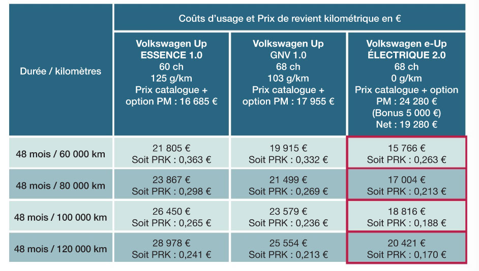 Dans ce second match, sont comparées à la Volkswagen Up! GNV 1.0 68 ch (émission de 103 g/km de CO2 ; prix d’achat 17.955 euros), les versions Essence 1.0 Eco 60 ch (125 g/km de CO2 ; 16.685 euros) et électrique e-up! 68 ch (0 g/km de CO2 ; 19.280 euros, bonus environnemental de 5.000 euros déduit pour les pros).Pour les 4 cumuls kilométriques, le gaz naturel l’emporte de plus ou moins 30 centimes au km sur l’essence : 0,332 contre 0,363 pour 60.000 km, 0,269 contre 0,298 pour 80.000 km, 0,236 contre 0,265 pour 100.000 km, 0,213 contre 0,241 pour 120.000 km. En revanche, la version électrique s’en sort encore mieux avec respectivement, pour ces 4 kilométrages, un PRK de 0,263, 0,213, 0,188 et 0,170 euro.