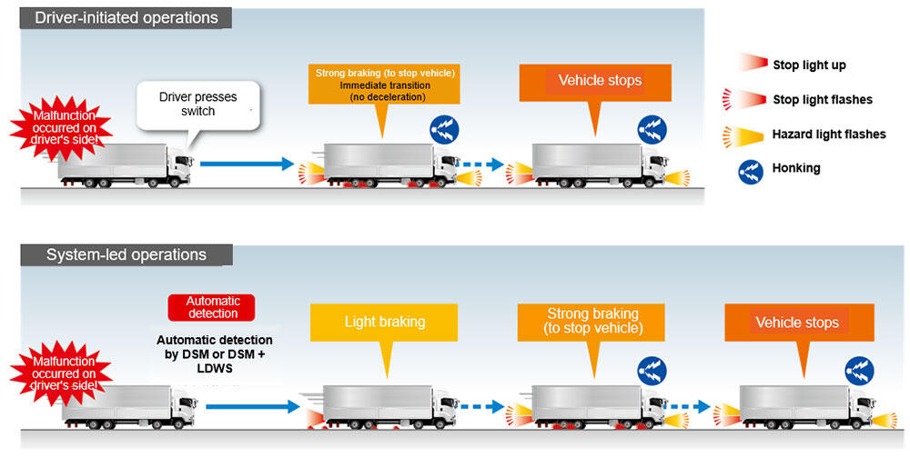 La dernière évolution en date ne porte pas sur le système gaz en lui-même, mais sur l’intégration d’un nouveau dispositif de sécurité. Déjà embarqué à bord des poids lourds diesel de la marque, l’EDSS (Emergency Driving Stop System) intègre désormais la gamme GNV du constructeur. Ce système détecte automatiquement les situations à risque grâce à une caméra embarquée (DSM) et peut engager un freinage progressif jusqu’à l’arrêt du véhicule. En cas d’activation, le système émet également des alertes sonores, visuelles, et envoie une notification par e-mail aux contacts prédéfinis.