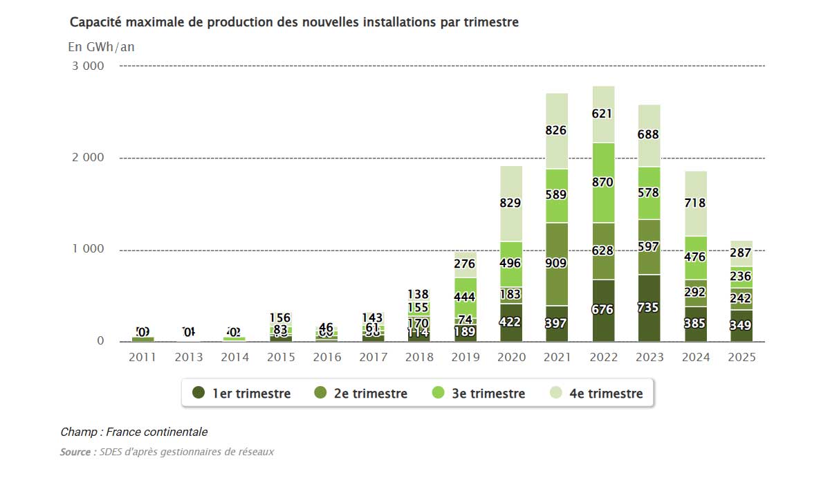 Le développement du biométhane se poursuit dans les réseaux gaziers, malgré un ralentissement du rythme de nouvelles capacités installées en 2025. Selon le dernier tableau de bord du Service des données et études statistiques (SDES) du ministère de la Transition écologique, 803 installations injectaient du biométhane dans les réseaux de gaz naturel en France au 31 décembre 2025. Leur capacité maximale atteint 15,5 TWh par an, soit une hausse de 8 % par rapport à fin 2024.