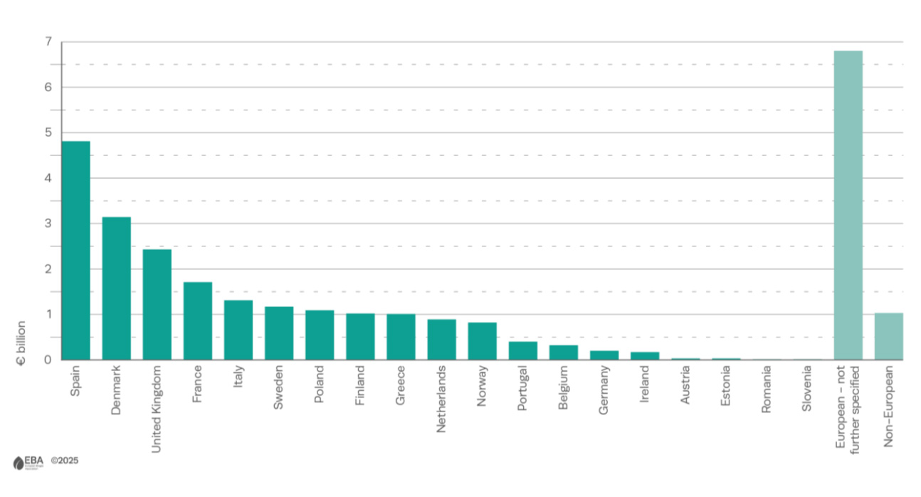 En matière d’investissements, trois pays se distinguent : Espagne (4.8 Md€), Danemark (3.1 Md€) et Royaume-Uni (2.4 Md€). La France arrive en 4e place avec 1.7 Md€ mobilisés.