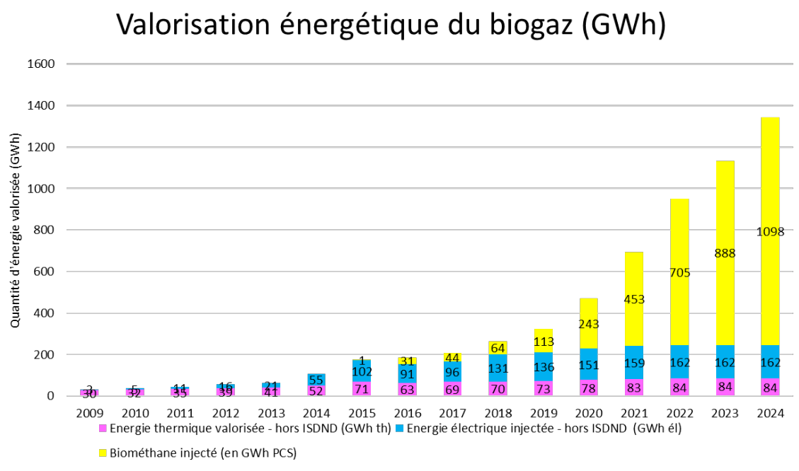 L’énergie valorisée atteint 1 344 GWh PCI, dont 82 % proviennent de l’injection. Entre 2018 et 2024, l’injection a été multipliée par 17, contre seulement 1,2 pour la cogénération.