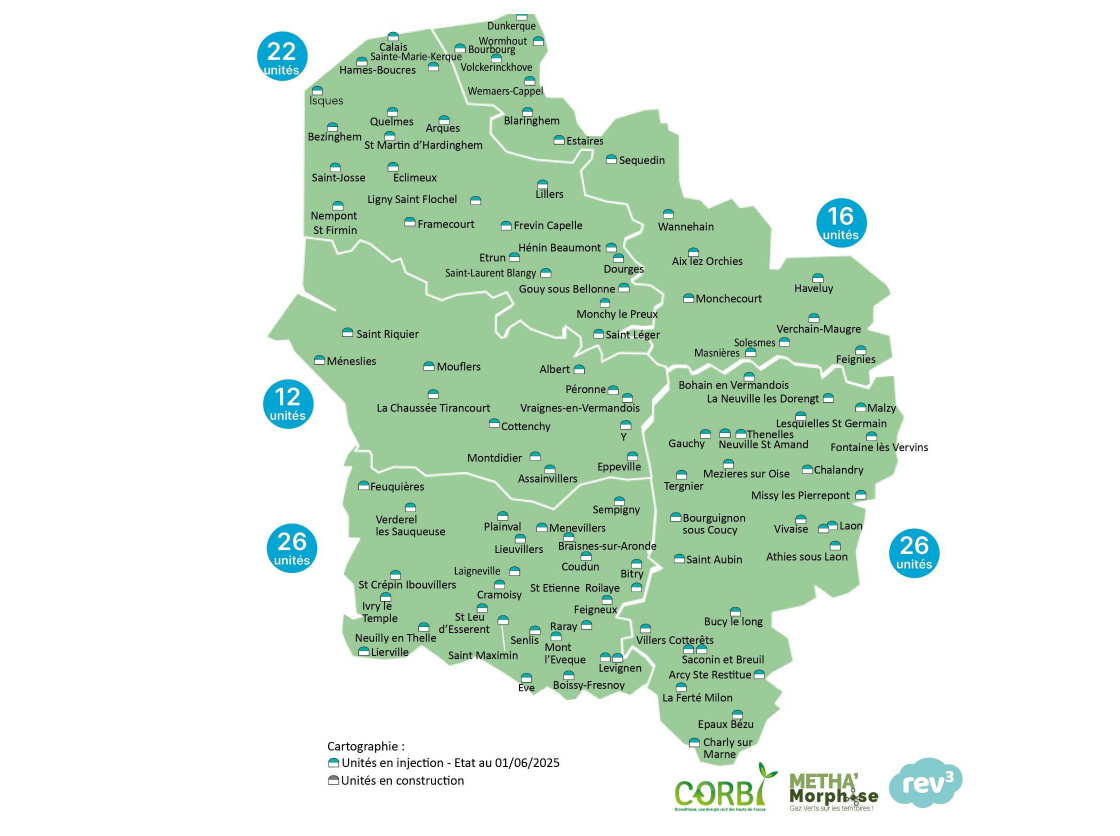 Historiquement gazière, la région Hauts-de-France se distingue par sa précocité dans l’injection de biométhane : la première unité a été mise en service en 2011 à Sequedin, dans le département du Nord. Avec désormais plus de 100 unités opérationnelles, la Région ambitionne de devenir la première région européenne en volume de biométhane injecté.Avec une production annuelle de 2,3 TWh, l’équivalent énergétique de 385 000 logements chauffés au gaz, la filière permet déjà d’éviter près de 450 000 tonnes de CO2 par an. Le CORBI, collectif régional d’acteurs du gaz vert, vise une capacité de 7 TWh d'ici à 2030.