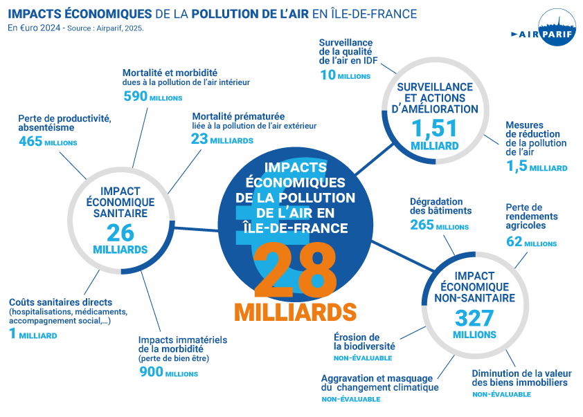Une étude d’Airparif chiffre à 28 milliards d’euros par an le coût de la pollution de l’air en région Ile-de-France. Des politiques de réduction, notamment dans les transports, permettent déjà des gains sanitaires et économiques majeurs.