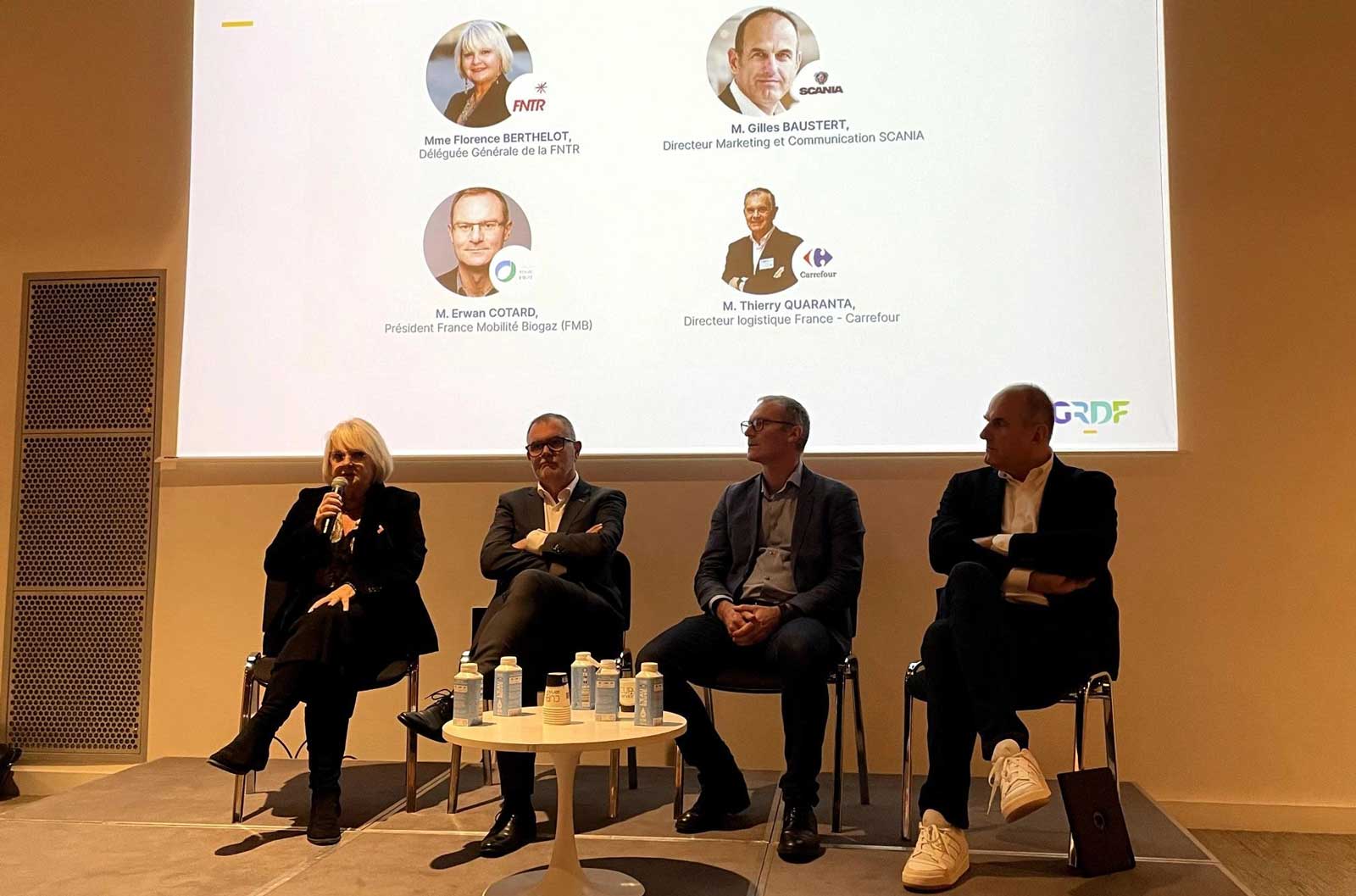 Portée par GRDF, une table ronde dédiée au bioGNV a été organiseé au salon Solutrans 2025. De gauche à droite : Florence Berthelot (FNTR), Thierry Quaranta (Carrefour), Erwan Cotard (France Mobilité Biogaz) et Gilles Baustert (Scania)