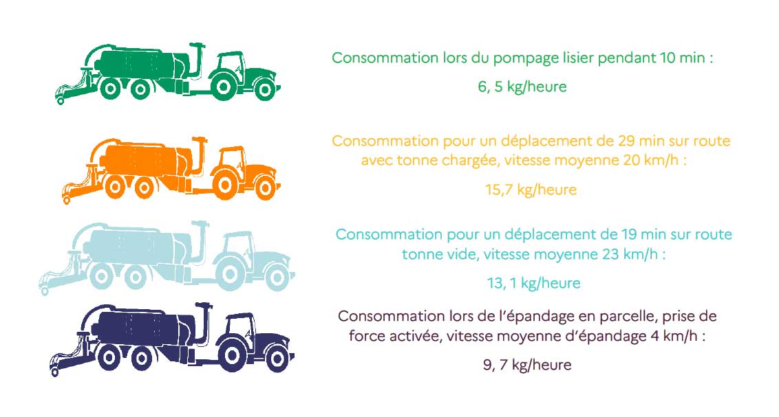 Les consommations de biogaz du T6 ont été mesurées lors d’un circuit complet d’épandage : 6,5 kg/heure lors du pompage du lisier ; 15,7 lors du déplacement de la tonne à lisier pleine en roulant à 20 km/h sur route pendant 29 minutes ; 9,7 lors de l’épandage à une vitesse de 4 km/h, prise de force en action ; 13,1 kg/h au retour à vide en roulant pendant 19 minutes à 23 km/h.