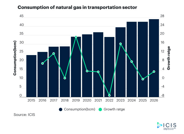 Malgré ces évolutions, la consommation de gaz naturel dans le transport chinois continue de progresser. Selon les prévisions d’ICIS, elle devrait atteindre 44,14 milliards de mètres cubes en 2026, soit une hausse de 3,5 % sur un an.