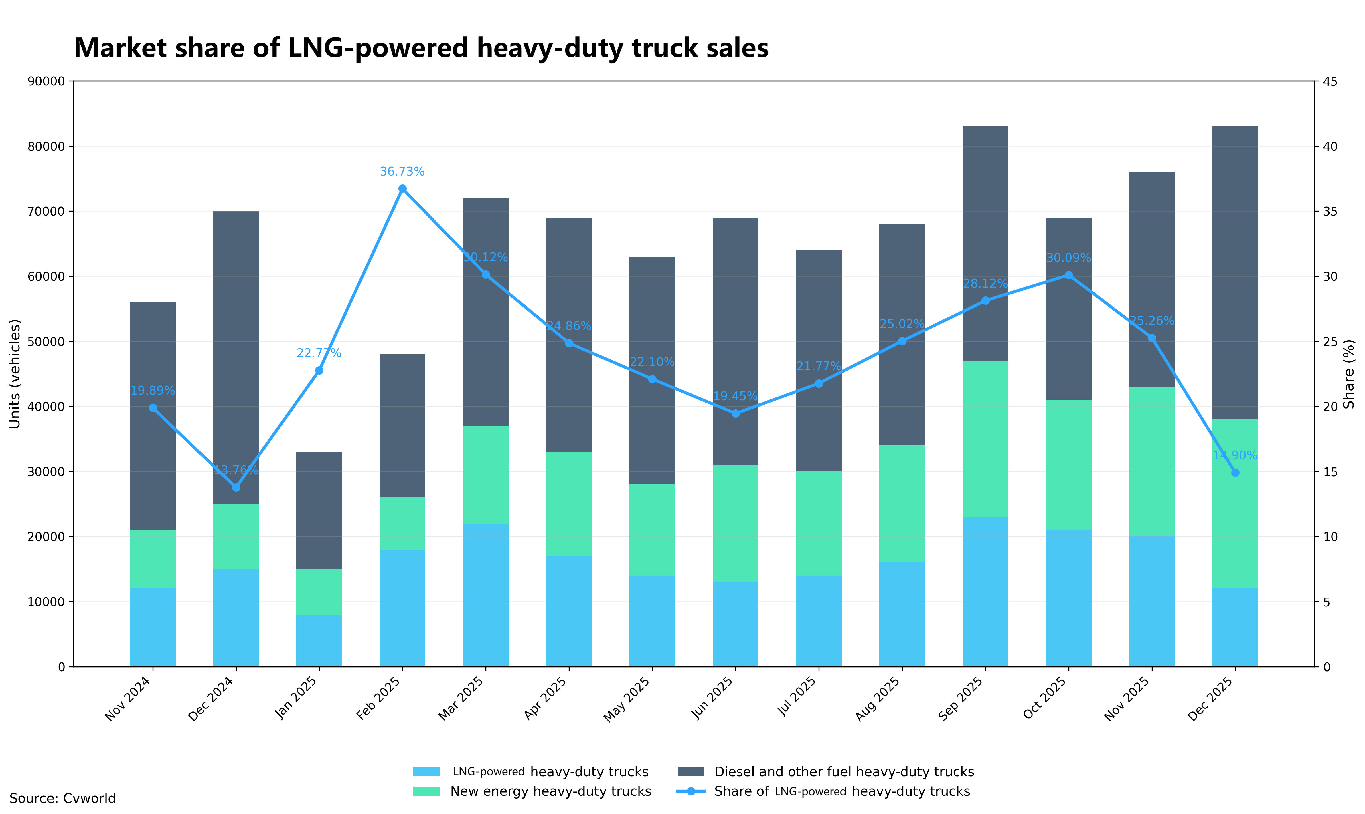 Le marché chinois des poids lourds au GNL reste dynamique malgré une concurrence croissante. En 2025, les ventes ont atteint environ 198 700 unités, selon les données du cabinet Commercial Vehicle World (CvWorld). Cela représente une hausse de 11,6 % sur un an.